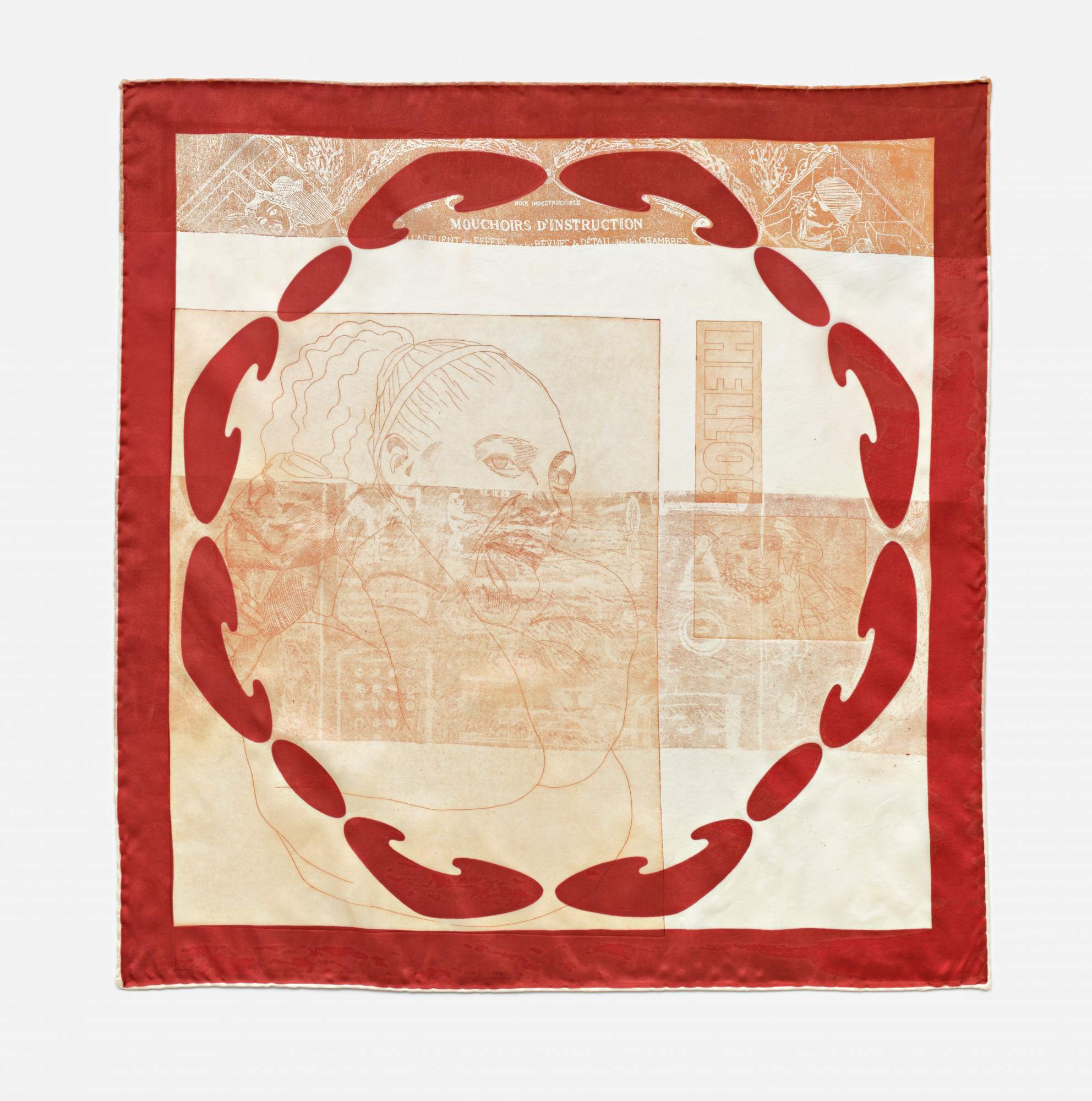 Josefine Reisch Muchoir D'Instruction (Hello! Bülent and Serena) 2020 screen print and etching on silk 80 × 74 × 3 cm 31 1/2 × 29 1/8 × 1 1/8 inches