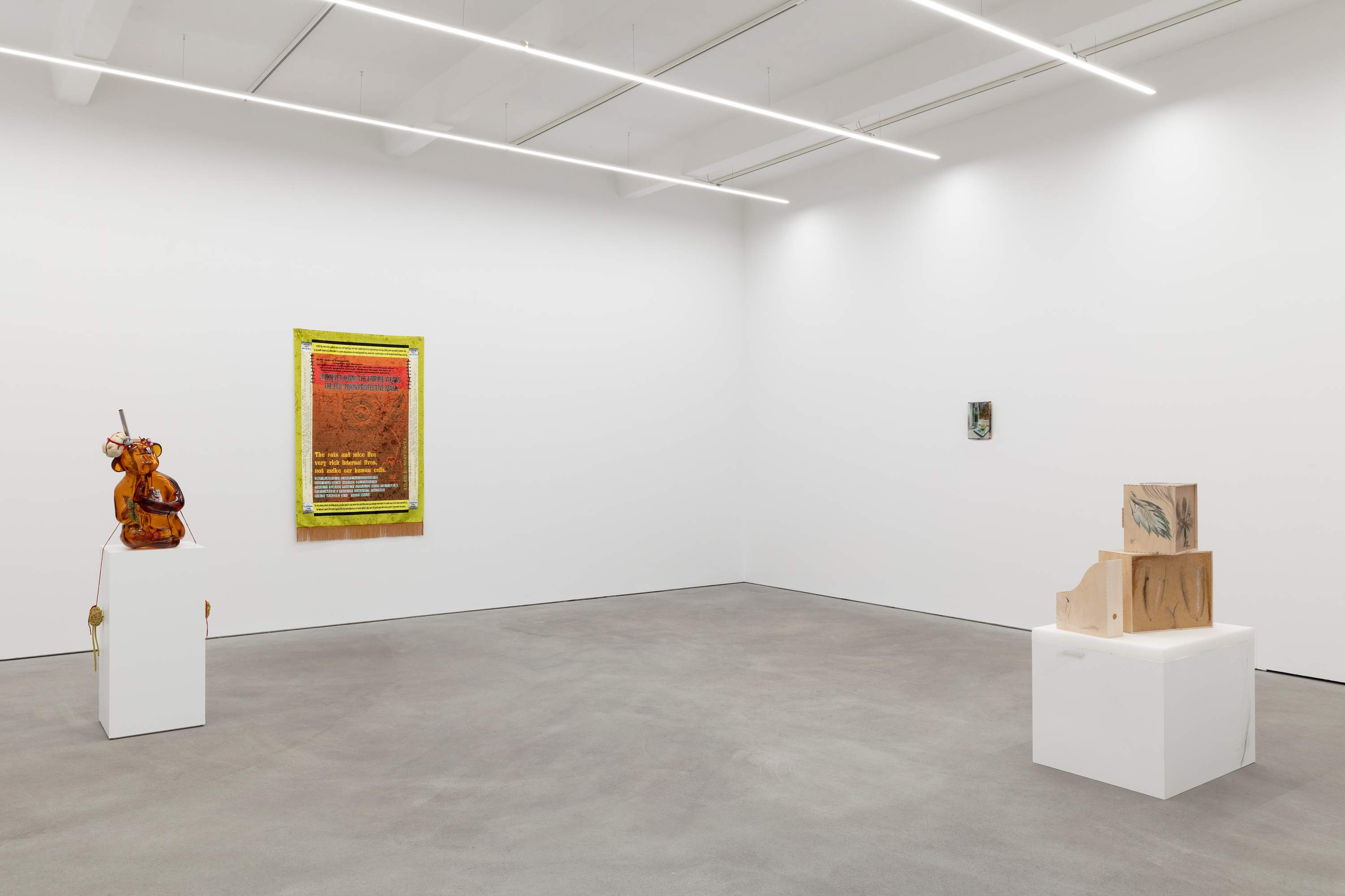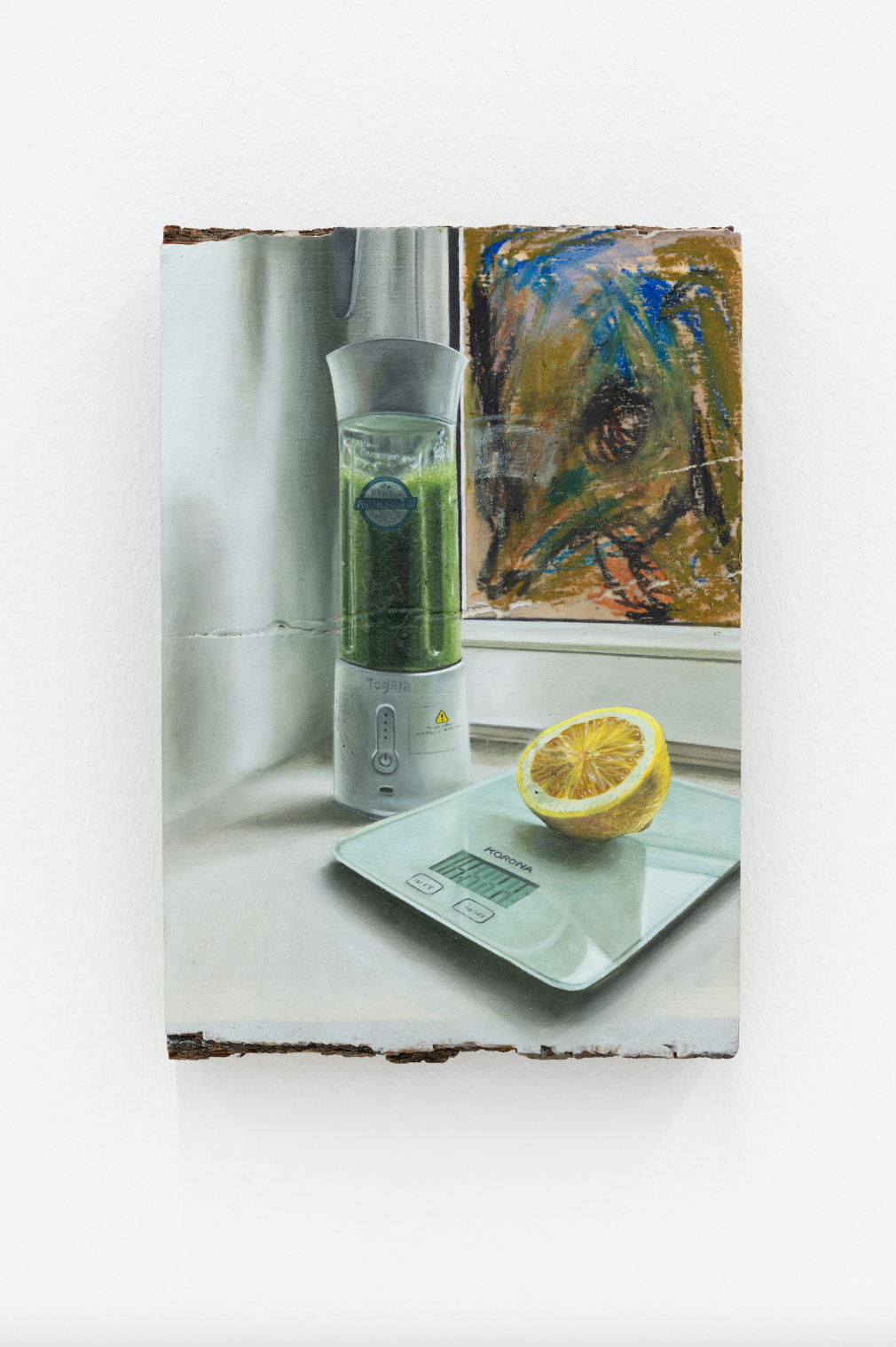 Alison Yip Juiced! 2022 oil, wrinkle cream, lorazepam, sunscreen, ashwagandha, active collagen, vitamin B12, iron, healing clay, pumice on wood 18 × 27 × 3 cm 7 1/8 × 10 5/8 × 1 1/8 inches