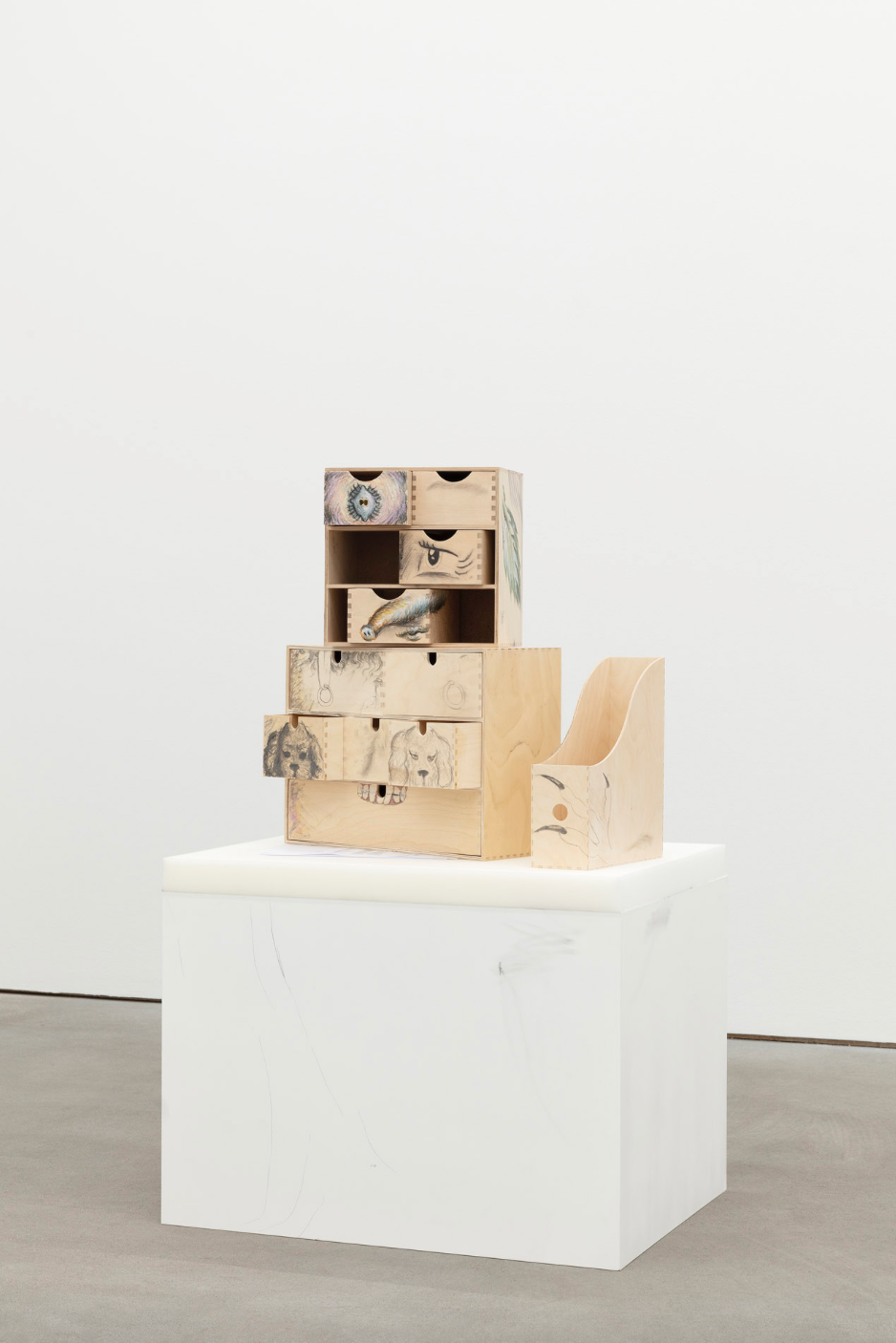 Alison Yip Untitled (goblin organizer) 2022 graphite, oil pastel, charcoal, on Ikea torage organizers (head) 20 x 28 x 28cm, (torso) 18.5 x 42 x 32cm, (arm) 8.5 x 24 x 30.5cm, (head) 8 x 11 x 11 in, (torso) 7 x 16.5 x 12.5 in, (arm) 3 x 9 x 12