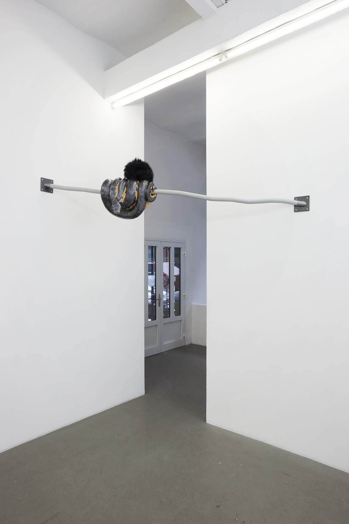 Gerrit Frohne-Brinkmann Prop and Predator 2024 lazed ceramics, robotic cat, cables, controller, various materials 98 × 142 × 42 cm 38 5/8 × 55 7/8 × 16 1/2 inches