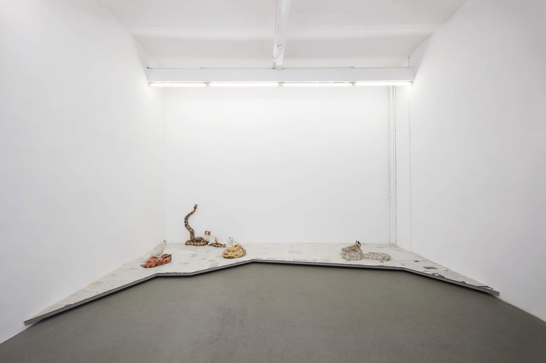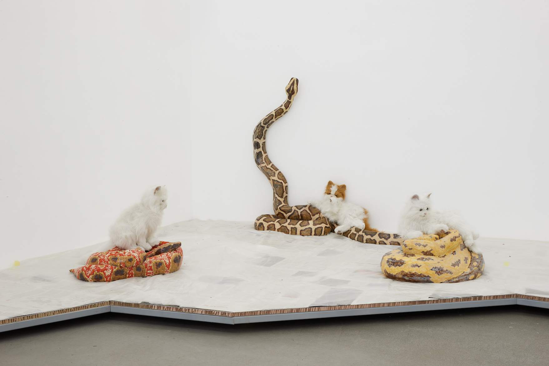 Gerrit Frohne-Brinkmann Predator and Prey 2024 Glazed ceramics, robotic cat, metal, paint, cables, controller, various materials 60 × 257 × 52 cm 23 5/8 × 101 1/8 × 20 1/2 inches