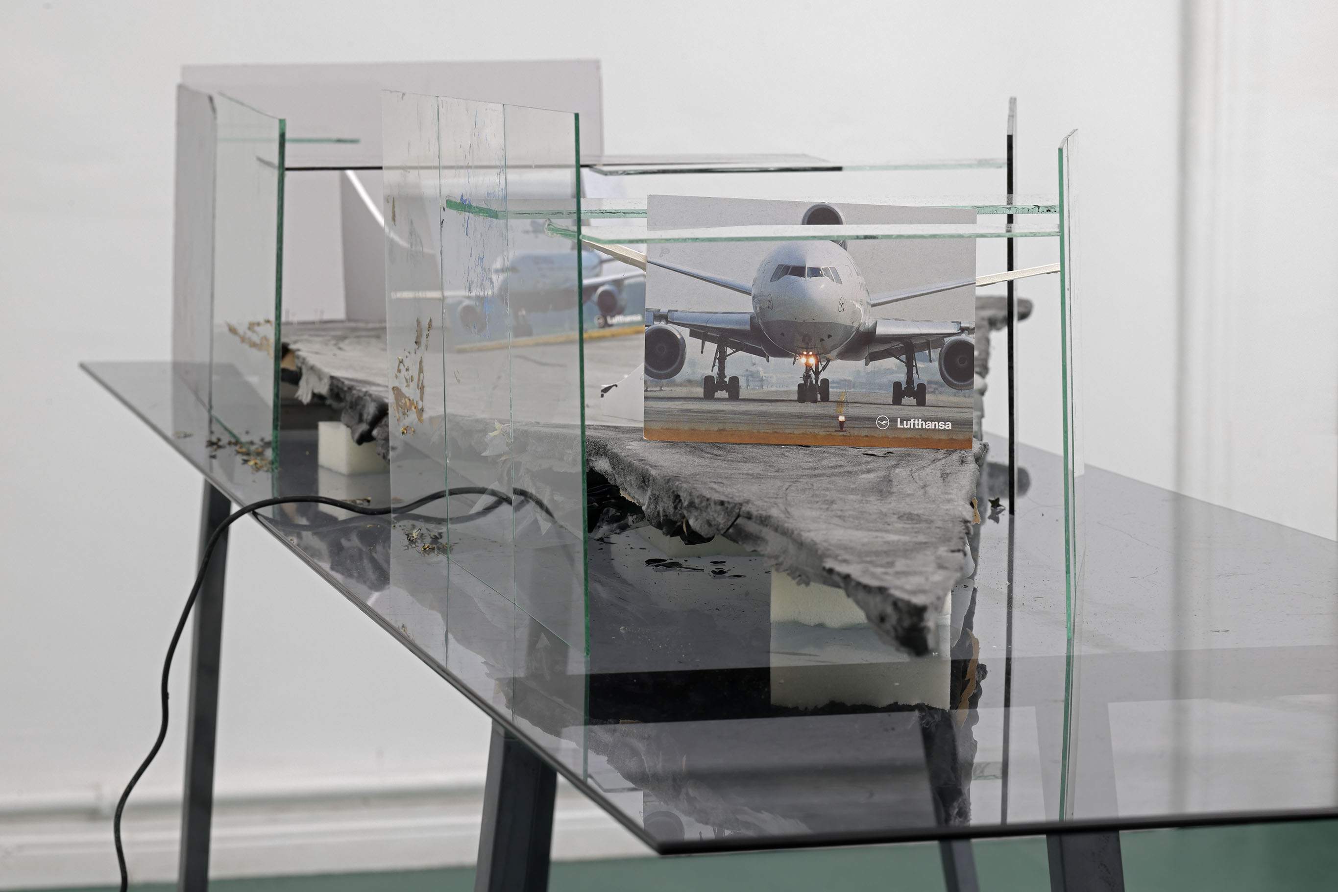 Irina Jasnowski Pascual Ancient Airport 2025 Runway: Postcards, cast foam, glass, imitation gold leaf, metal legs, motor 148 × 80 × 92 cm 58 1/4 × 31 1/2 × 36 1/4 inches
