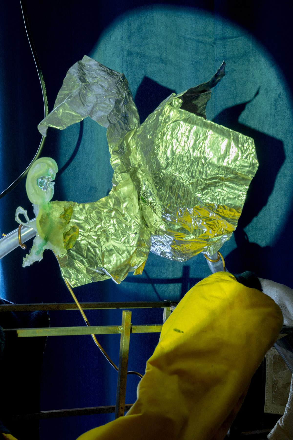 Irina Jasnowski Pascual The Kiss (1896) 2022 Aluminum, plasticine, resin, jackets, tubing, found objects, copper wire, carpet 53 × 81 × 168 cm 20 7/8 × 31 7/8 × 66 1/8 inches