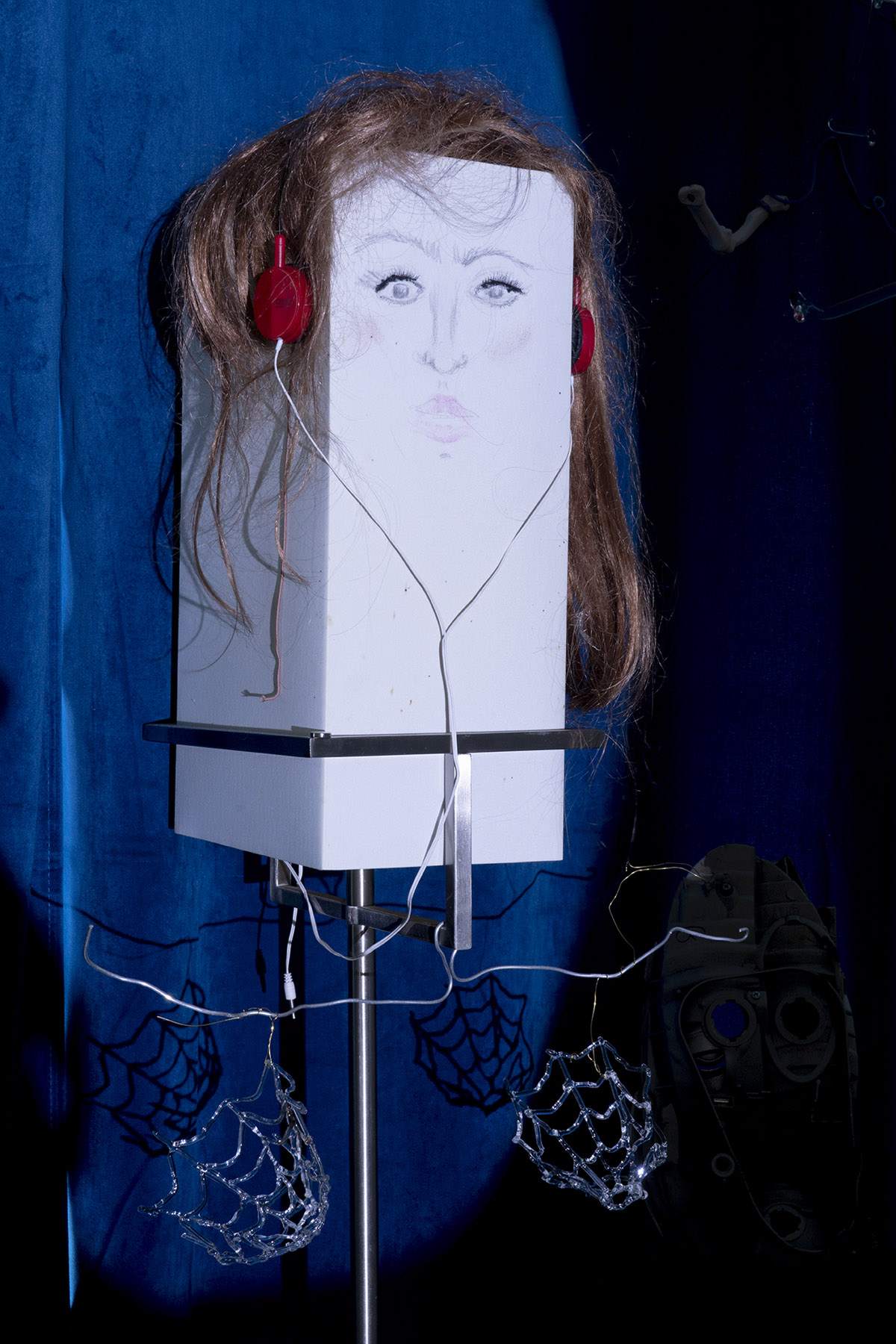 Irina Jasnowski Pascual Lamp 2021 Lightbulb, wig, headphones, color pencil, magnetic eyelashes, lipstick, blush, graphite, aluminum wire, borosilicate glass 46 × 30 × 183 cm 18 1/8 × 11 3/4 × 72 inches