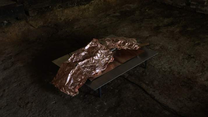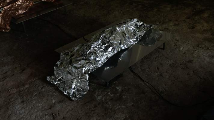Irina Jasnowski Pascual Wiper 1 2023 Light shielding foil on top of Ford F150 windshield wiper motor, stainless steel, zip ties, steel 120 × 50 cm 47 1/4 × 19 5/8 inches