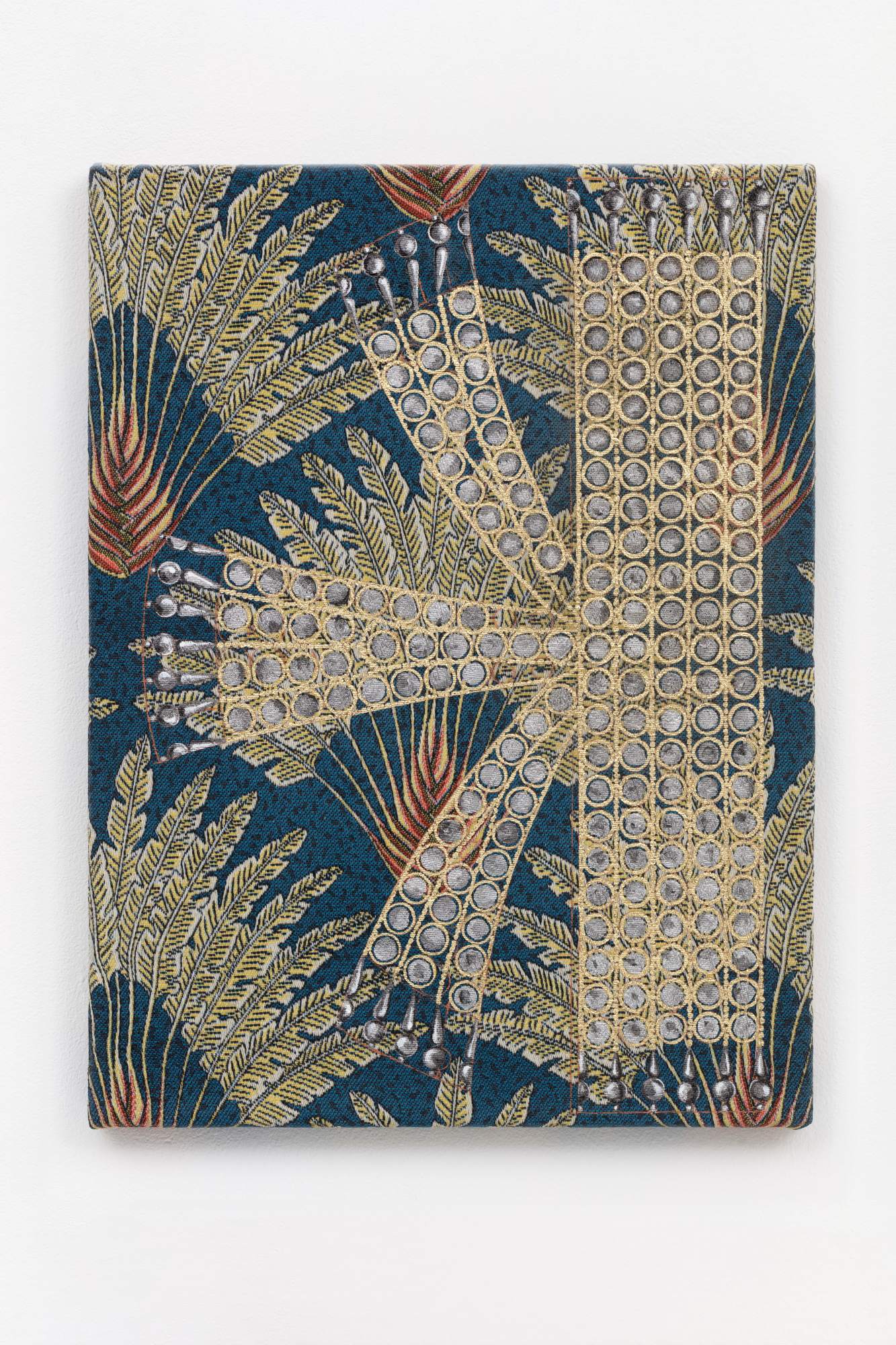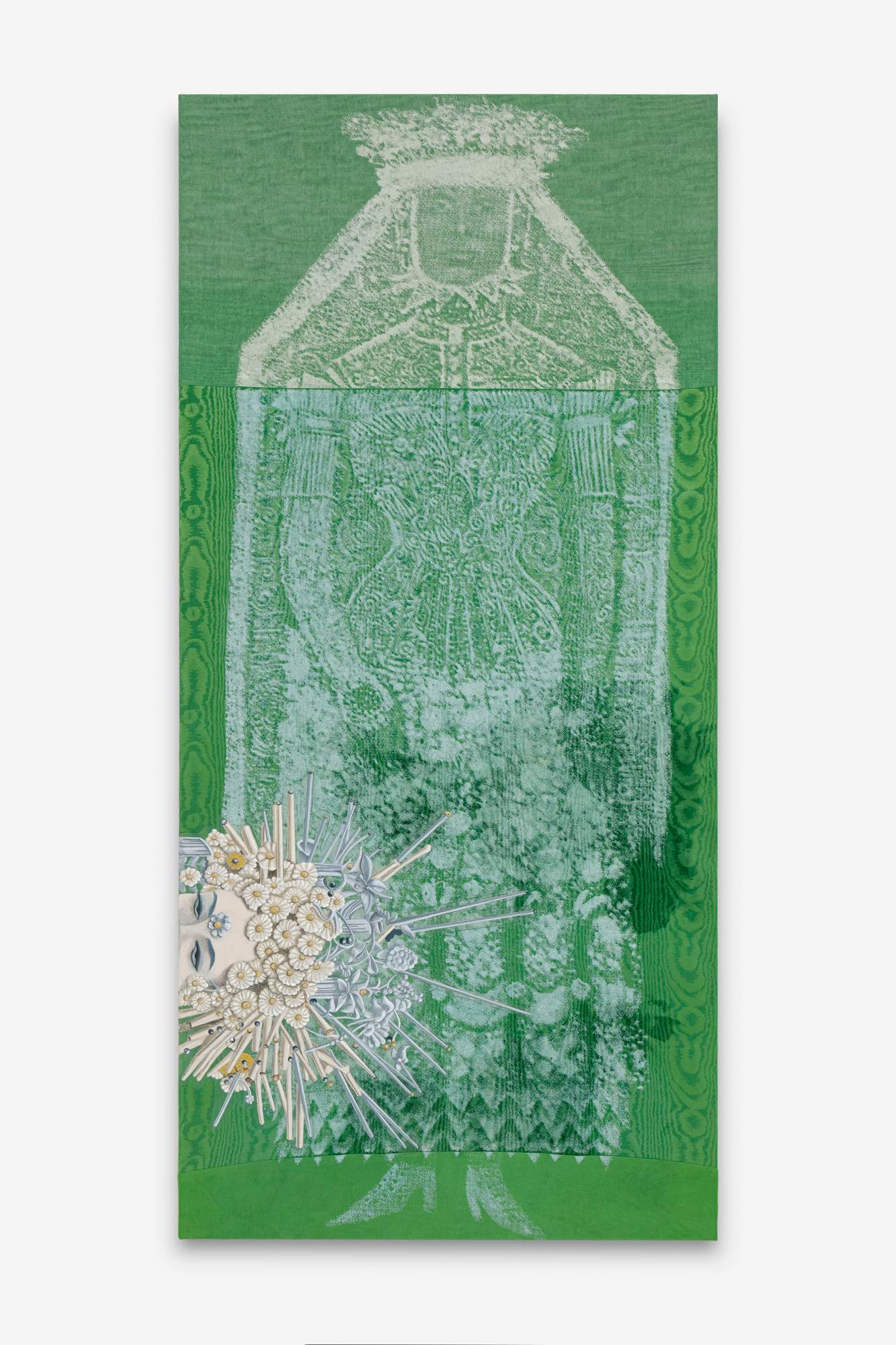 Josefine Reisch Comissioner (Tudor Pearls) 2024 Screenprint and oil on textile collage 160 × 70 cm 63 × 27 1/2 inches