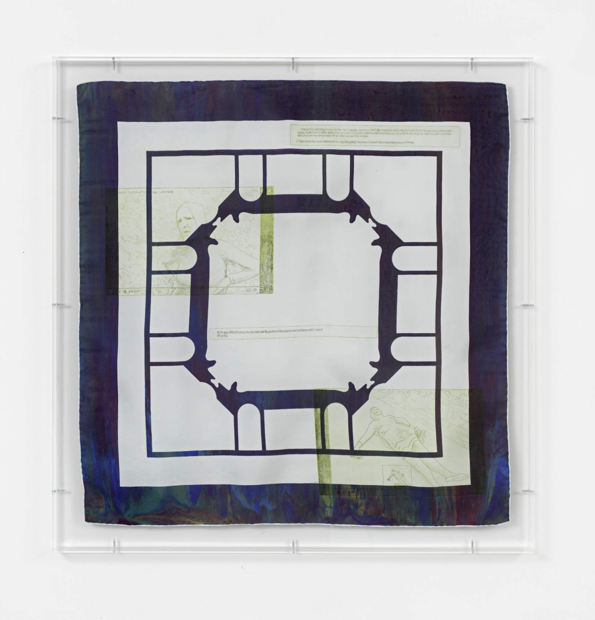 Josefine Reisch Sometime It's Hard to Keep the Line Between the Past and the Present 2020 screenprint and etching on silk 72 × 71 × 3 cm 28 3/8 × 28 × 1 1/8 inches