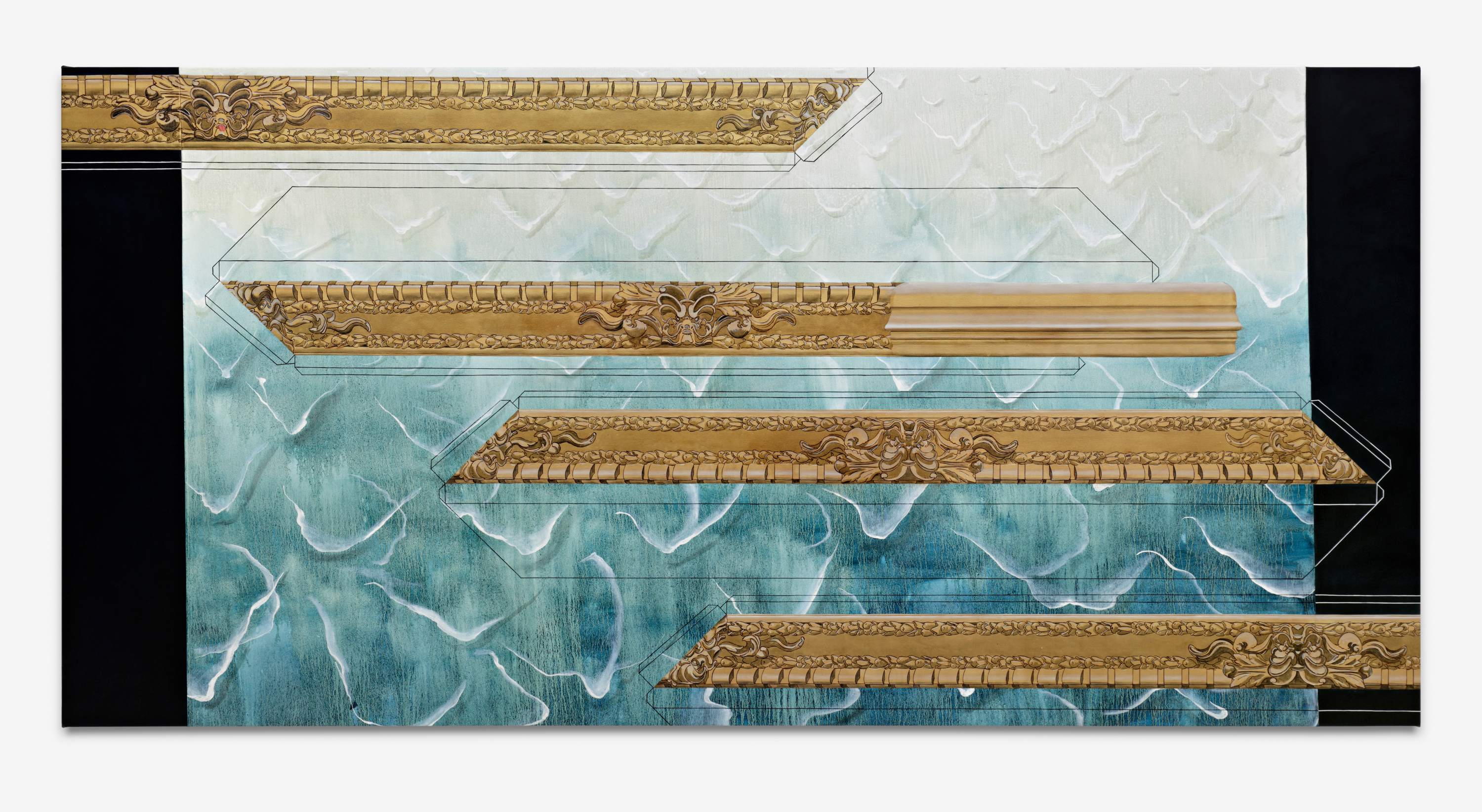 Josefine Reisch Framing The Death of Marat as seen in Brussels, Paris, Dijon, Reims and Versailles 2024 Oil and metal leaf on canvas 160 × 240 cm 63 × 94 1/2 inches