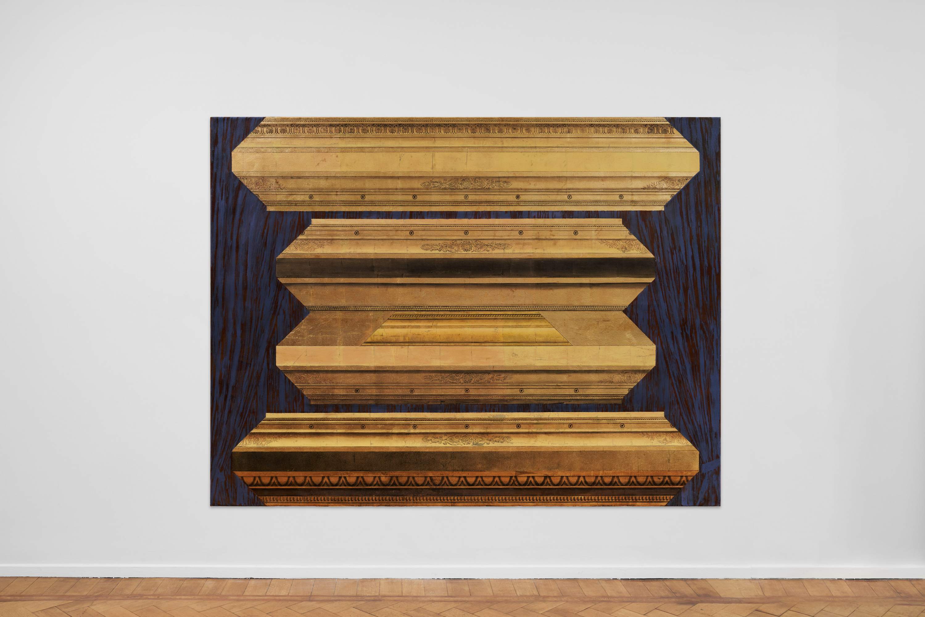 Josefine Reisch Framing The Death of Marat as seen in Brussels, Paris, Dijon, Reims and Versaille 2024 Oil and metal leaf on canvas 160 × 240 cm 63 × 94 1/2 inches