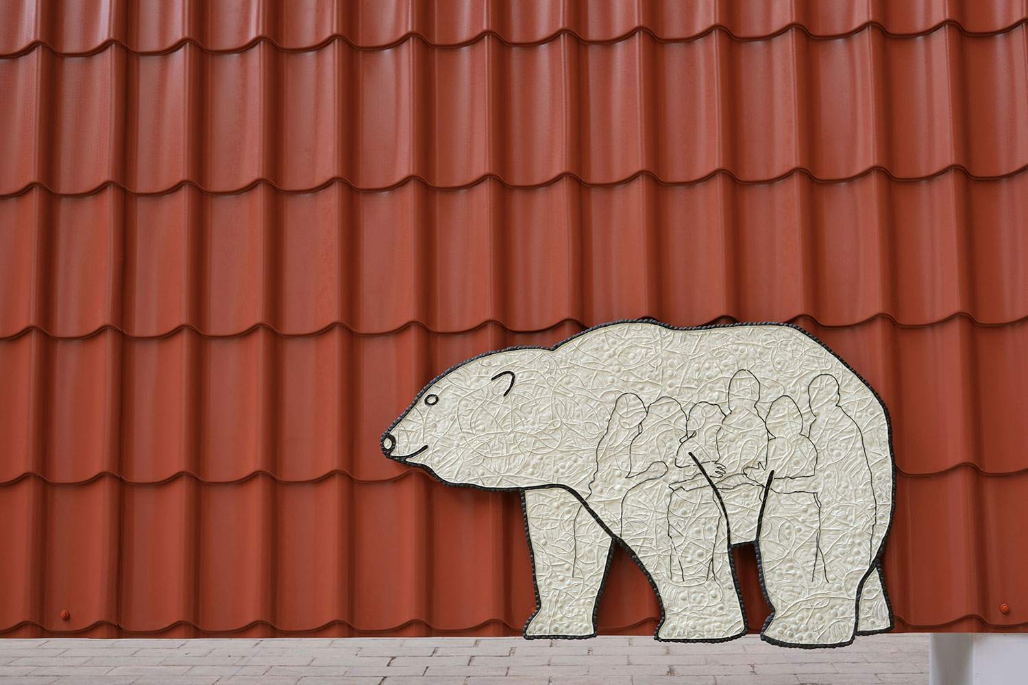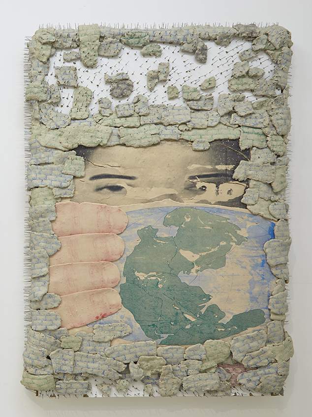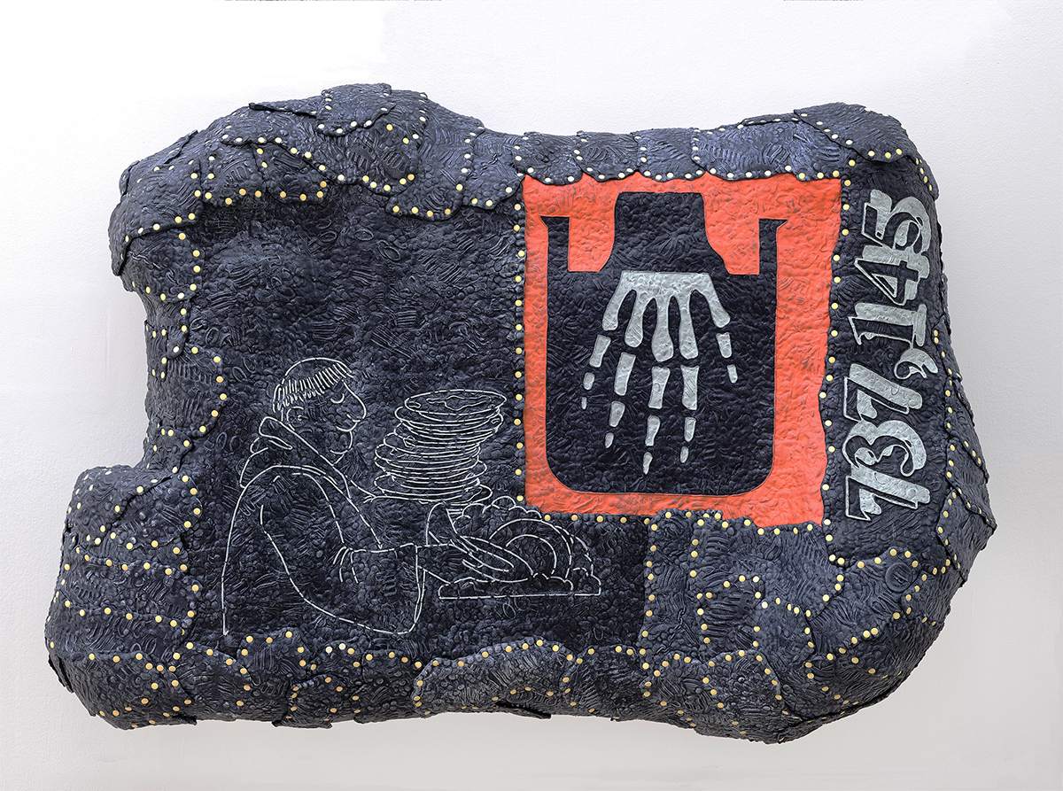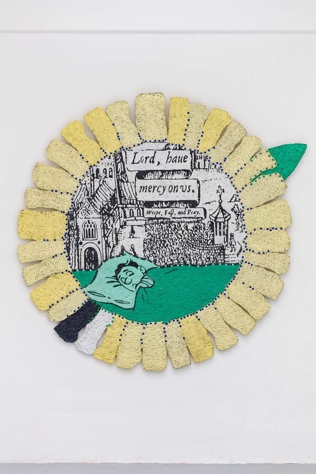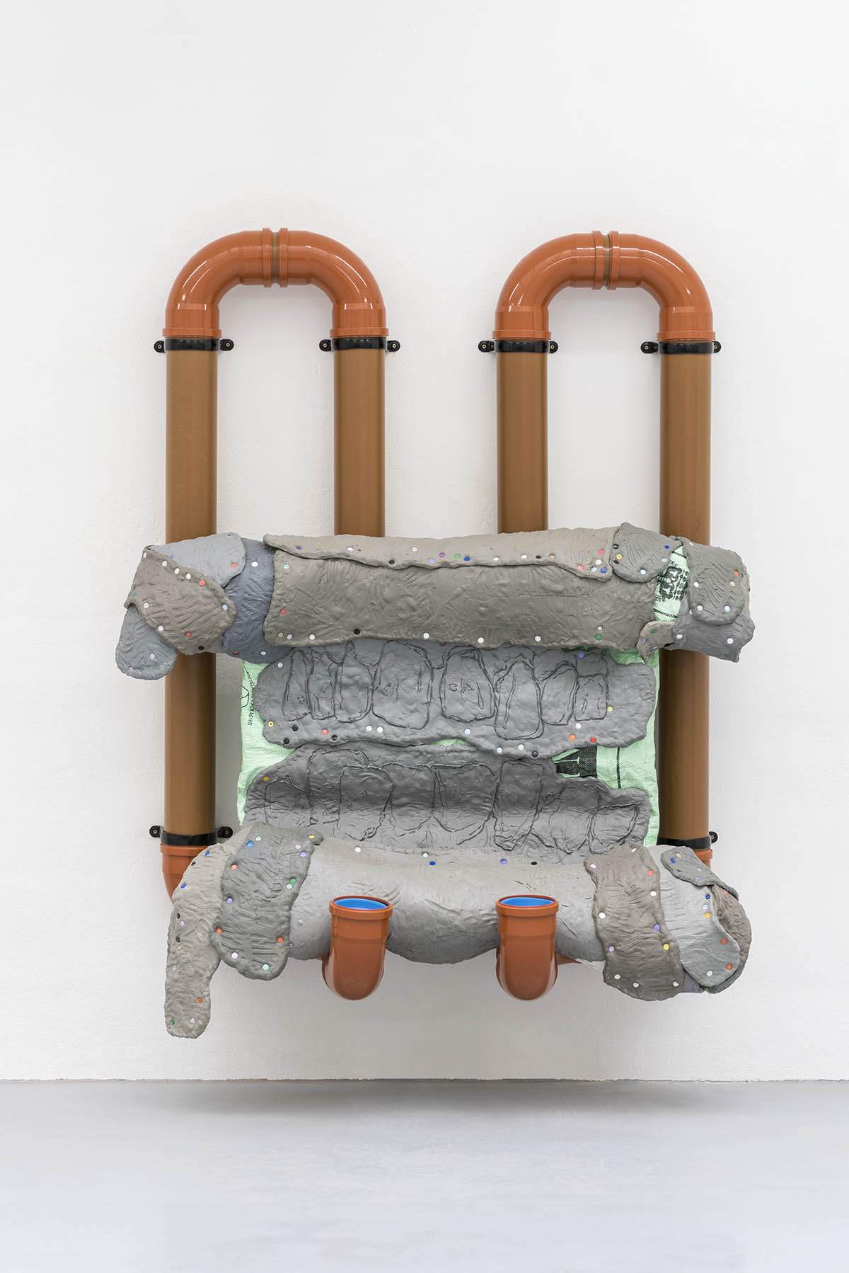 Sebastian Jefford Sometimes I can’t tell if you’re my world or my Wilson 2018 Polyurethane foam, acrylic, latex, waste pipes, plastic snaps, plaster bandage, chicken wire, woven polypropylene, biro 155 × 125 × 60 cm 61 × 49 1/4 × 23 5/8 inches