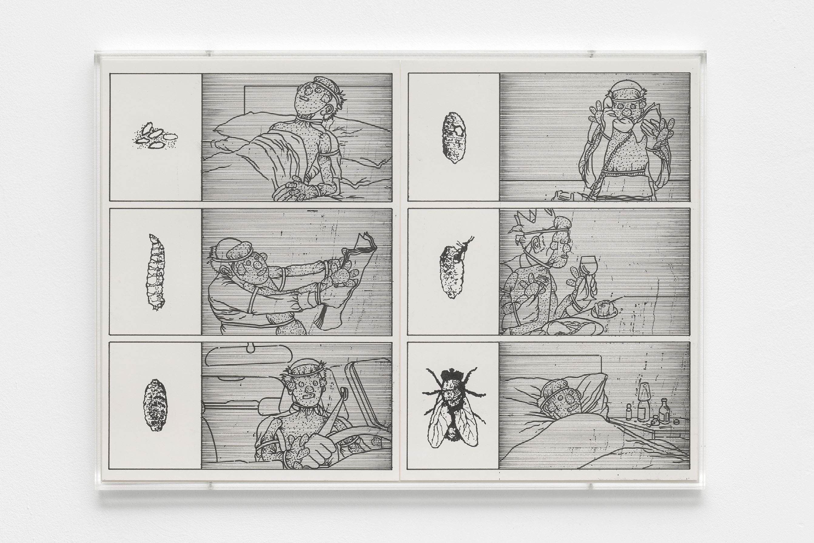 Sebastian Jefford Life cycle of a maggot 2025 Pen on paper 43 × 31 cm (framed) 16 7/8 × 12 1/4 inches (framed)
