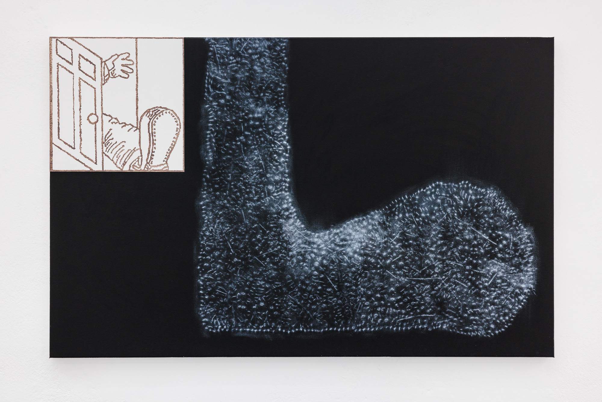 Sebastian Jefford Repeat the lie, that makes it true 2023 Acrylic and India ink on canvas 150 × 95 cm 59 × 37 3/8 inches