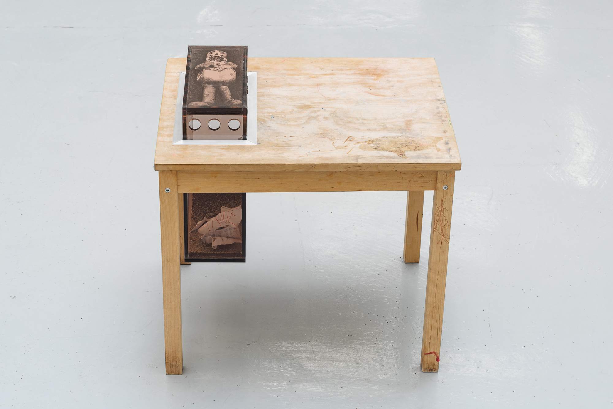 Jefford’s multidisciplinary practice spans sculpture, drawing, painting, writing and video, yet his open-ended approach often yields hybrid forms that elude categorisation. Working with recurring materials and repurposed everyday objects, his pieces frequently carry the uncanny familiarity of scaled-up miniatures or pseudo-functional props—objects that might belong to some alternate educational display or speculative world-building model.