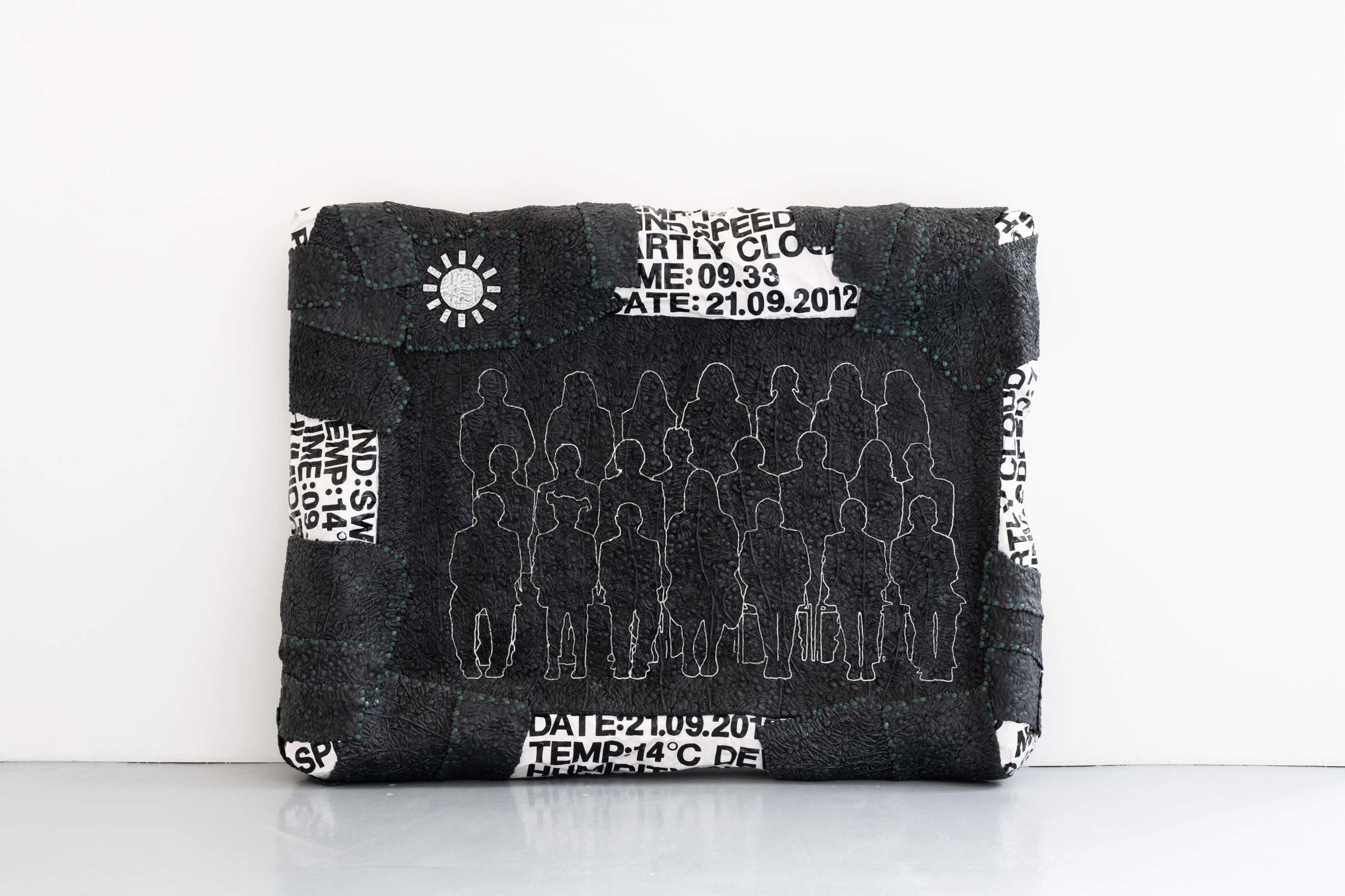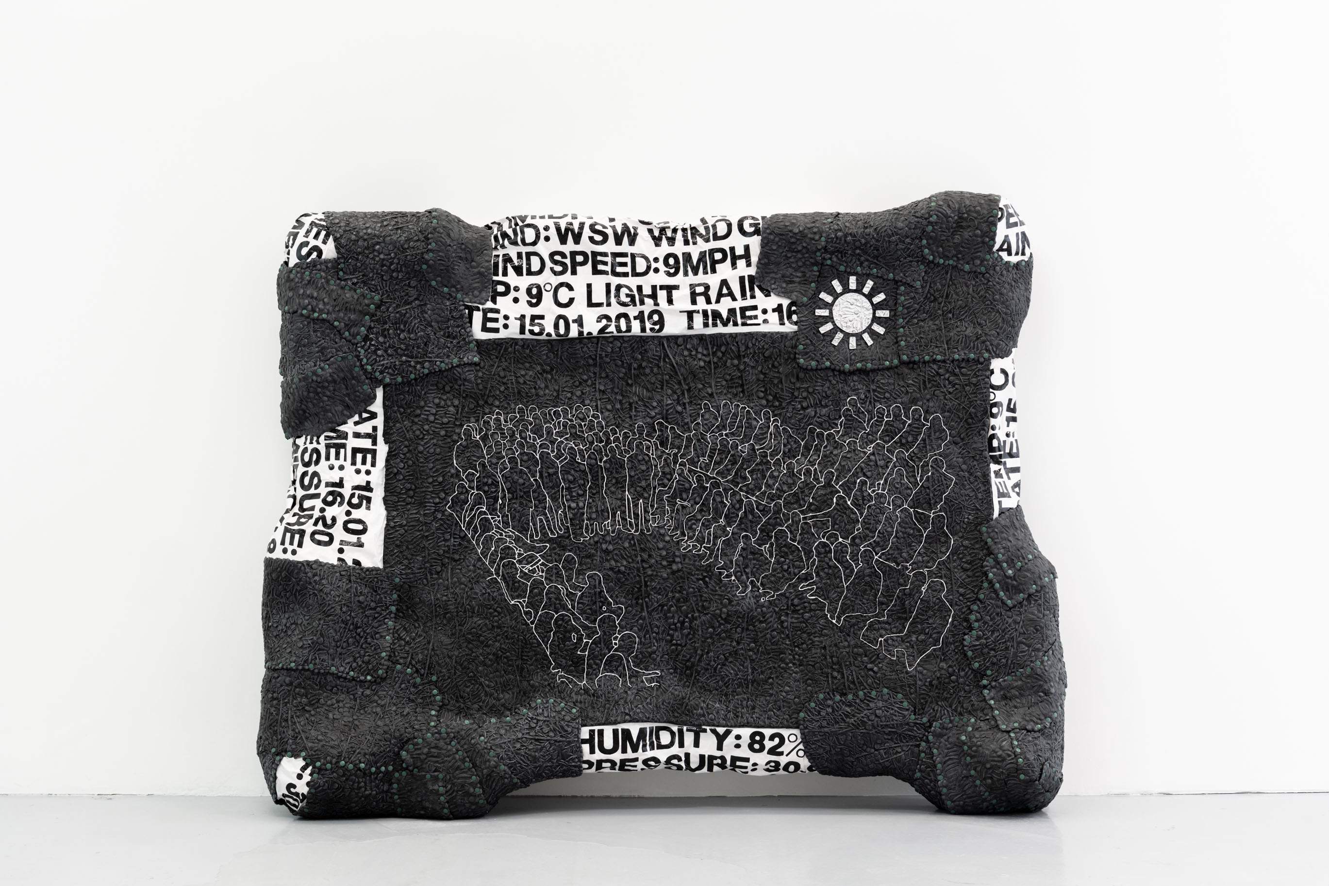 Sebastian Jefford Whatever the weather, the sun always shined on Tuesday afternoons 2022 Polyurethane foam, acrylic, plastic snap fasteners, styrofoam, polypropylene fabric, paint marker, cardboard, wood 165 × 200 × 28 cm 65 × 78 3/4 × 11 inches
