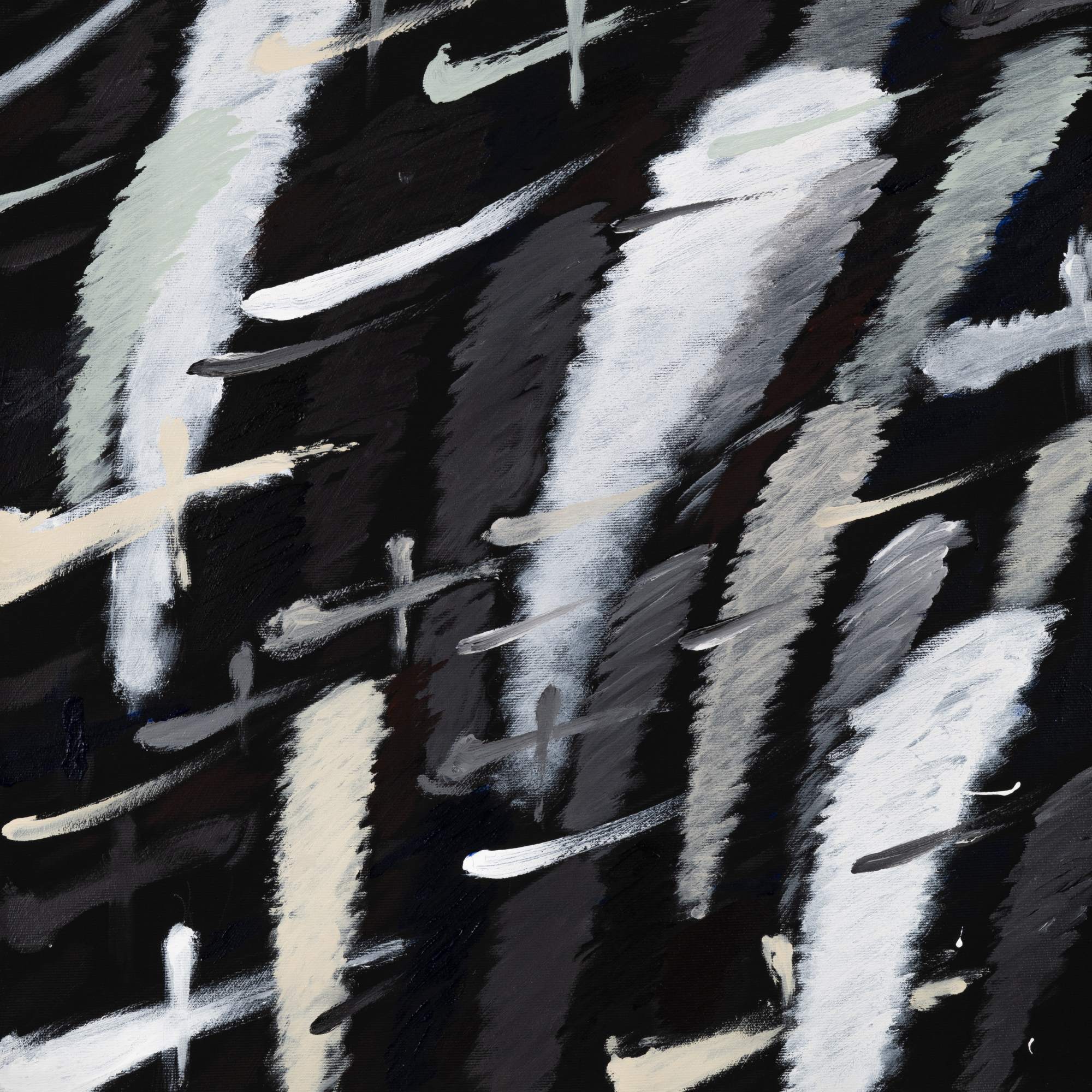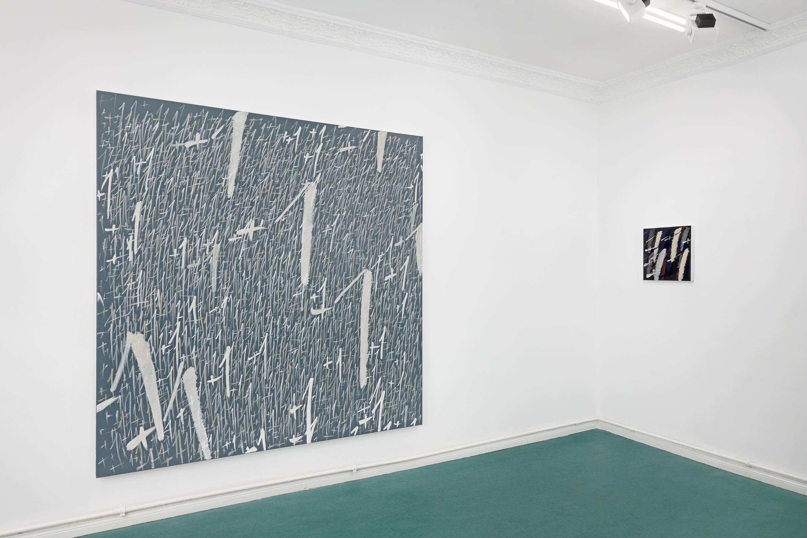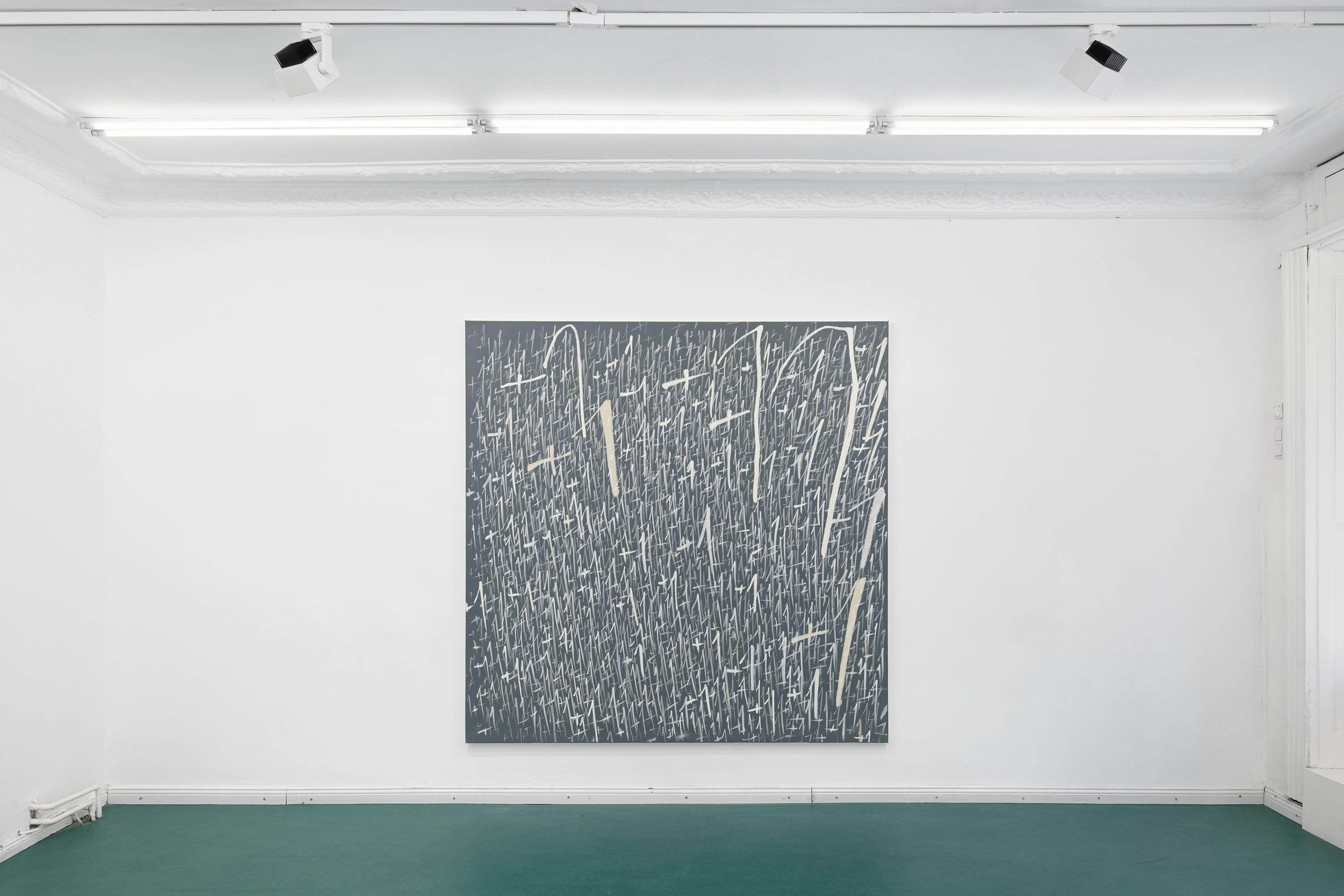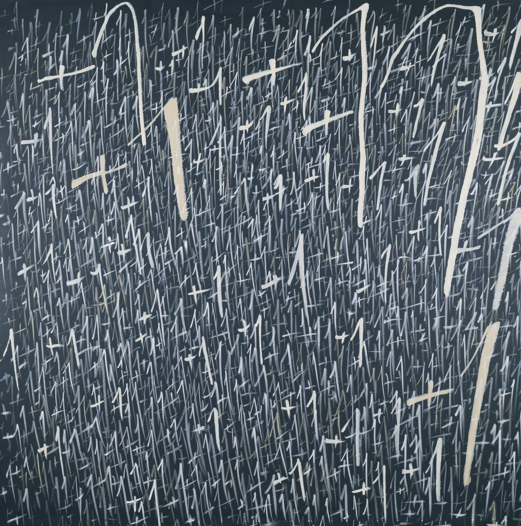 These questions are embedded within the very textures of Dregos’ gestures. Central to this body of work is the recurring "+1" motif, applied with a rhythmic, almost ritualistic compulsion. Each iteration is distinct, yet as they accumulate, they recede into the illusory depths of the pigment, creating a dense field of visual static.