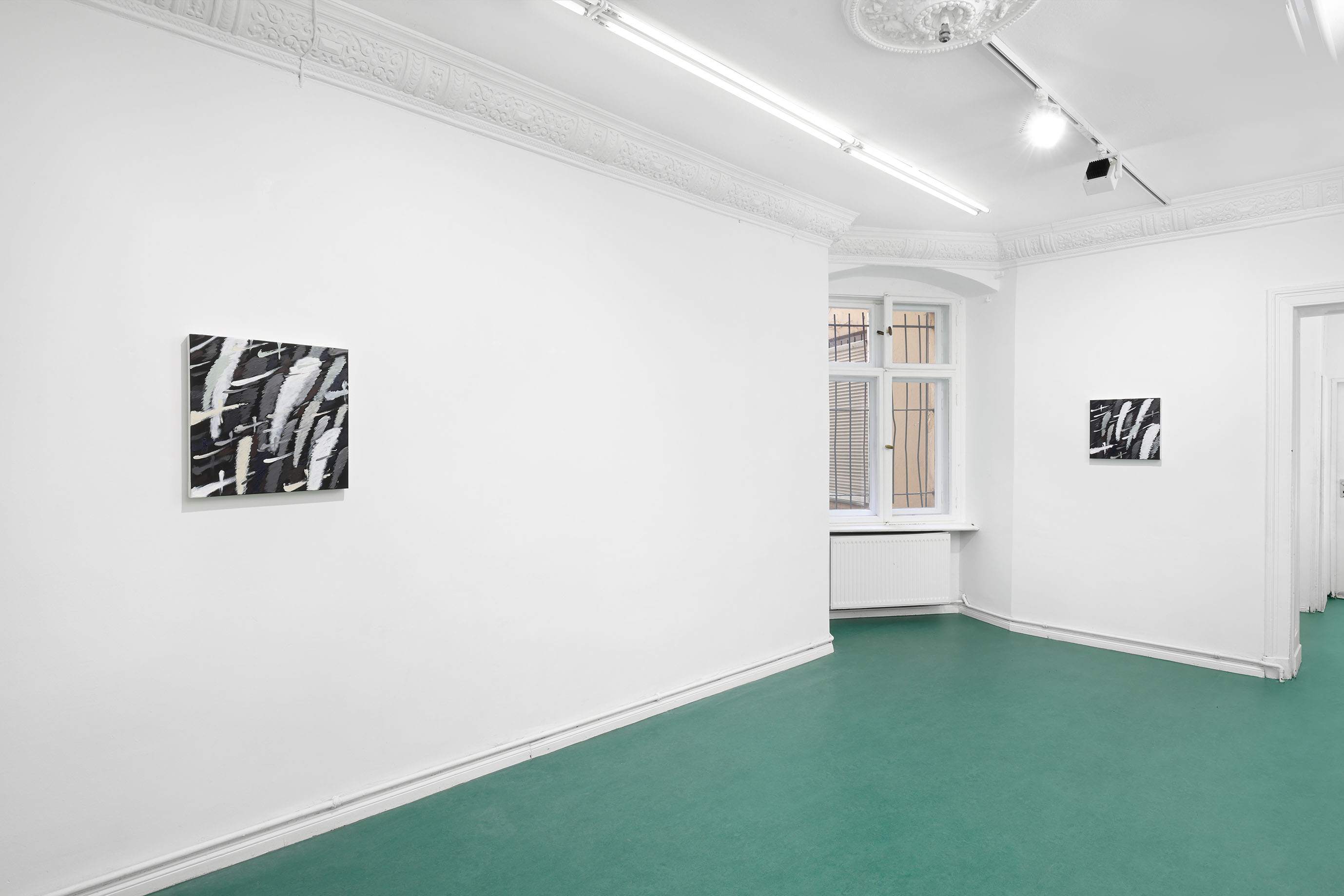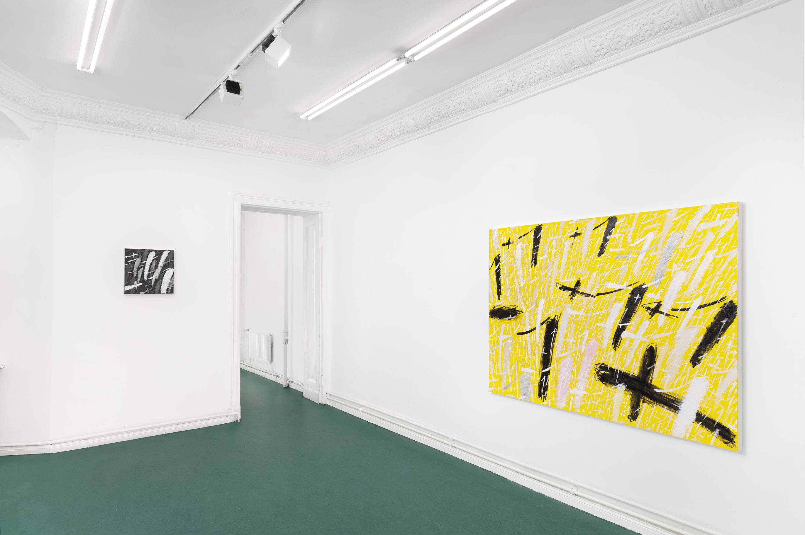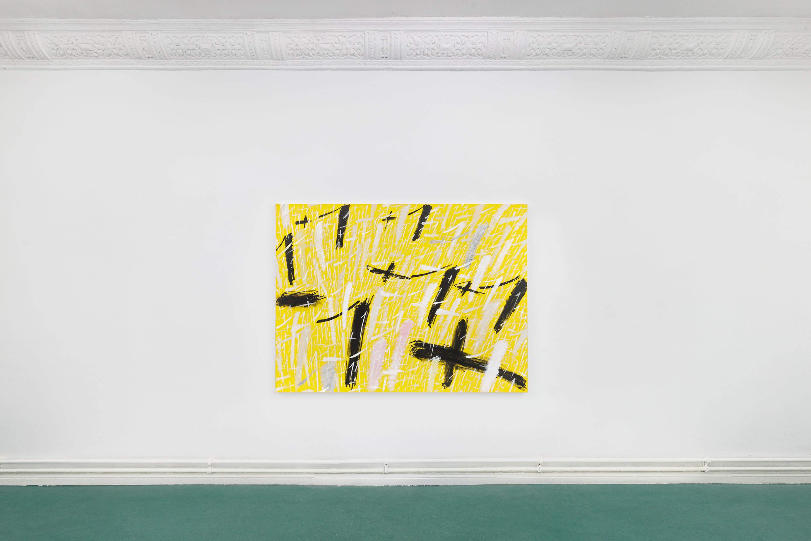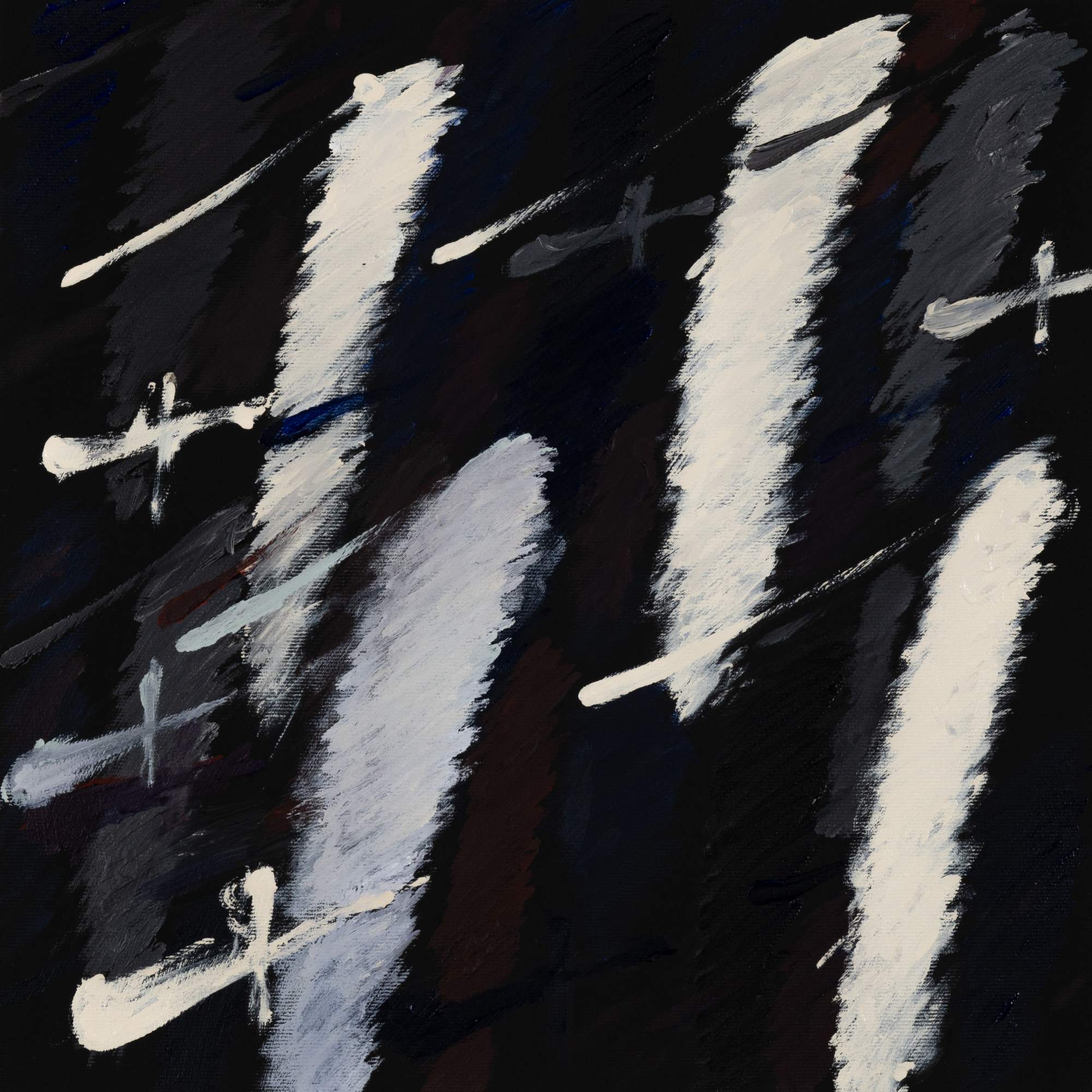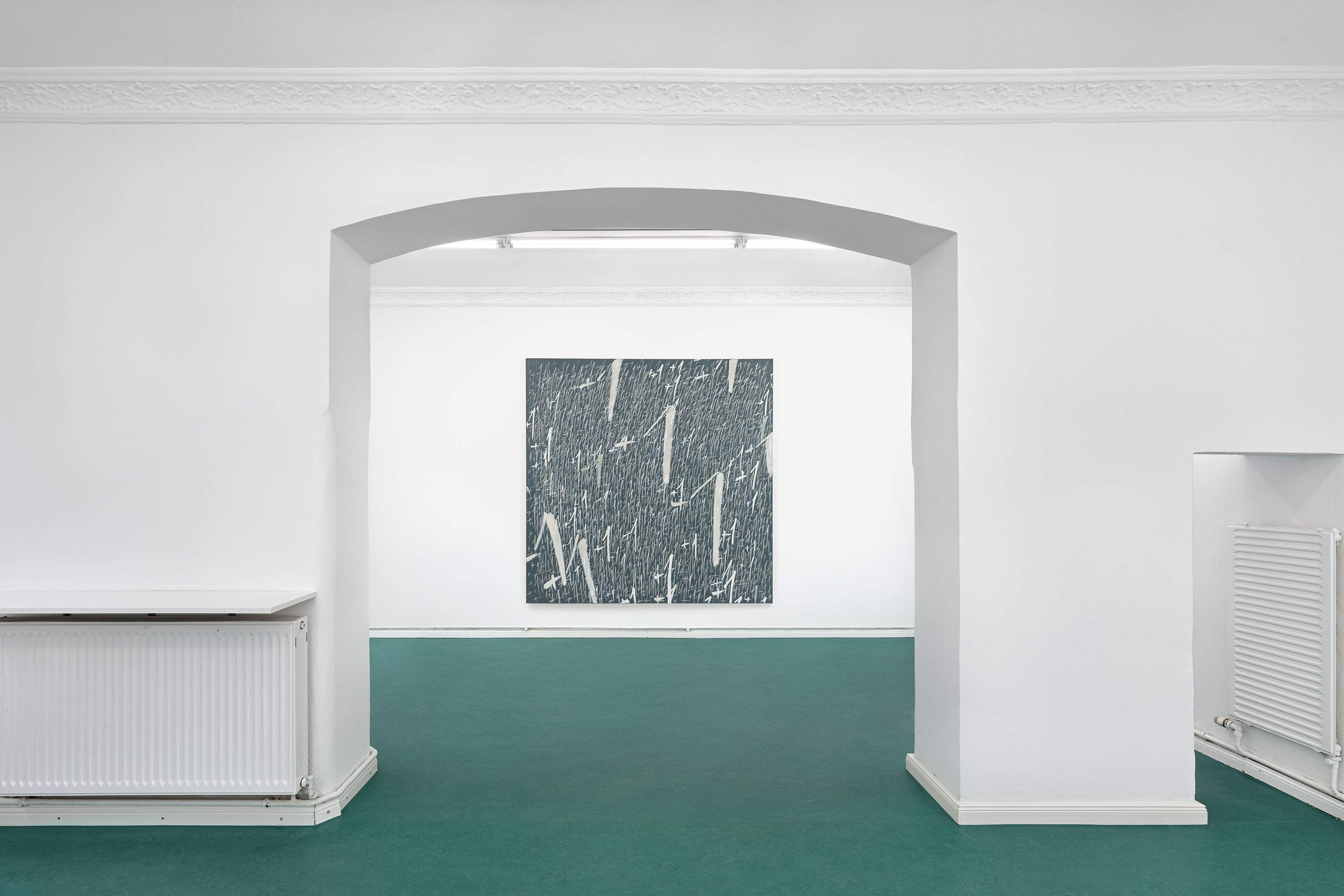 These questions are embedded within the very textures of Dregos’ gestures. Central to this body of work is the recurring "+1" motif, applied with a rhythmic, almost ritualistic compulsion. Each iteration is distinct, yet as they accumulate, they recede into the illusory depths of the pigment, creating a dense field of visual static.